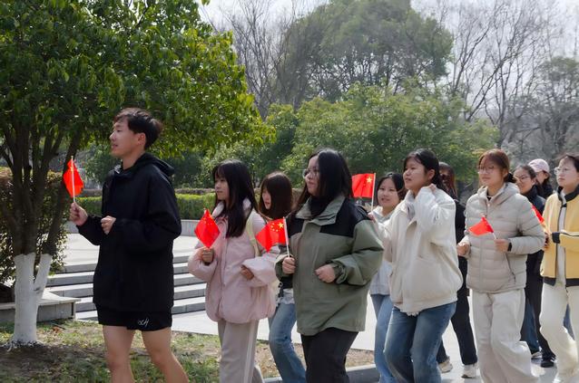随后,师生们手持小国旗,从合一广场出发,沿校园主干道有序慢跑。**图书馆、文科楼、体育馆、学生公寓,最终返回起点。大家在奔跑中感受春风拂面,欣赏樱花初绽、绿意萌动的校园春景,体悟学校百年办学历程中积淀的文化底蕴与蓬勃生机。