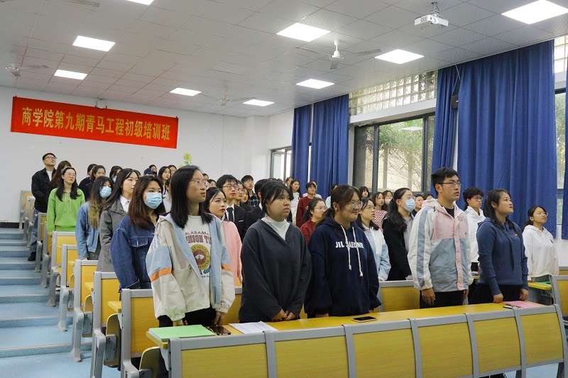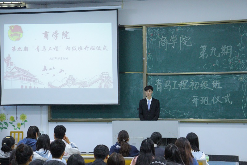 仪式开始,全体师生起立,奏(唱)共产主义青年团团歌。主持人宣读了本期“青马工程”初级班培训方案及考核要求。分团委宣传部成员方学睿和21经济与金融2班班长徐志勤代表全体学员郑重承诺将在培训中认真学习,坚定理想信念,提升个人工作能力,为学院发展奉献青春力量。最后,杨治菁老师向全体学员介绍了“青马工程”初级班的意义,勉励大家在培训中深化理论学习,坚定理想信念;加强实践锻炼,提高工作技能;树立身份意识,发挥桥梁纽带作用,努力成为老师们思想教育的好助手。