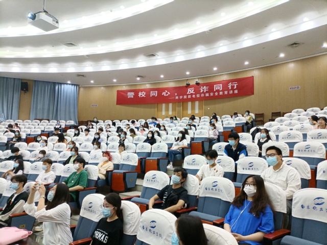 李警官首先通过一个真实的诈骗案例切入主题,她指出,近年来全国受骗金额总和高达万亿,这庞大的数字引得在座同学们大吃一惊。同时她就诈骗分子的作案手段和过程,以及一些常见的诈骗类型进行了详细分析,诸如刷单、淘宝购物诈骗、购买游戏装备诈骗等,而这些常见的骗局却引得群众屡屡上当。李警官分析了出现这种现象的原因:一是电信诈骗的背后是组织性极强的团伙作案,他们分工细致明确,会事先对诈骗对象进行深入了解,再加上特定的剧本引诱受害人一步步入局,令人防不胜防;二是受害人本身的防范意识不强,没有一种怀疑的逆向思维,犯罪分子的圈套怎么摆就怎么钻。对此李警官强调,个人一定要加强反诈意识,不轻信那些电话短信,保护好自己的钱袋子。最重要的是人防物防不如技防,及时下载启用“国家反诈中心”APP也能有效降低受骗的可能性。李警官语言幽默生动,和同学们互动频繁,现场气氛热烈,宣传效果极佳。