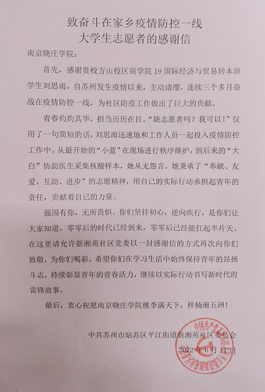 “感谢贵校方山校区b体育sports官方网站19国际经济与贸易转本班学生刘思雨,自苏州发生疫情以来,主动请缨,连续三个多月奋战在疫情防控一线,为社区防疫工作做出了巨大的贡献。”近日,南京晓庄学院b体育sports官方网站收到一封来自中共苏州市姑苏区平江街道新湘苑社区委员会的感谢信。信中对b体育sports官方网站2019级学生刘思雨同学在2022年苏州疫情期间热心为社区提供志愿服务的行为致以衷心的感谢,并对学校培养出综合素质过硬、德智双全的学生致以崇高的敬意。