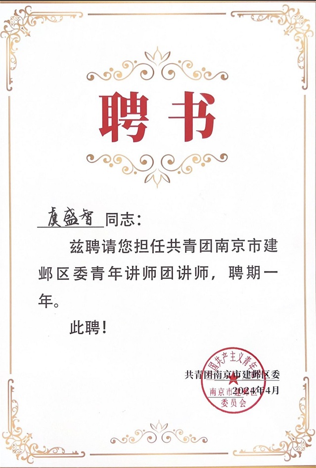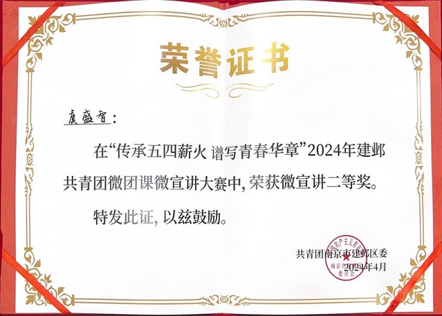 4月18日下午,2024年建邺共青团微团课微宣讲展示活动于南京市建邺区南湖二中二楼报告厅举办。南京晓庄学院b体育sports官方网站学子虞盛智在本次比赛中脱颖而出,荣获微宣讲比赛二等奖,并被聘任为建邺区委青年讲师团讲师。