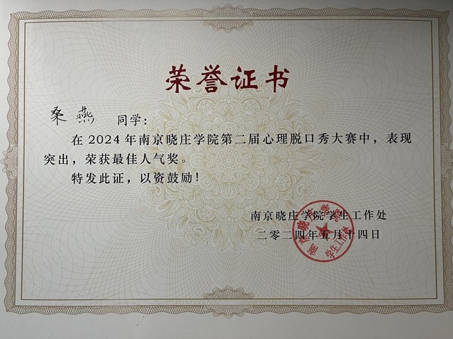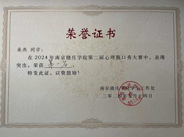 桑燕心理脱口秀第一名证书